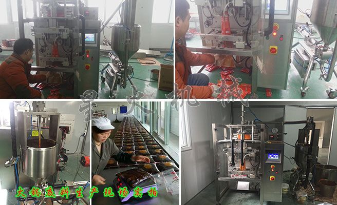 這款火鍋底料包裝生產線,火鍋料全自動包裝生產線是我司精心研制專業針對火鍋底料、火鍋調料以及豆豉醬等各種袋裝醬料進行包裝的機械設備。該生產線是由貯料罐 + 打料泵 + 顆粒醬料灌裝機 + 火鍋底料包裝機 + 滾筒攪拌機等設備組成,包裝過程中可自動完成計量、下料,將物料直接灌入容器中并完成包裝,使用非常的簡單方便,適合中小型企業的生產需要。