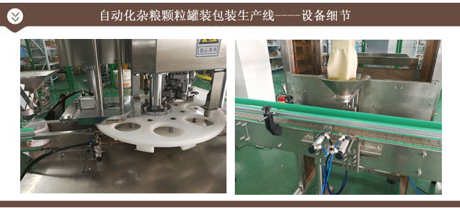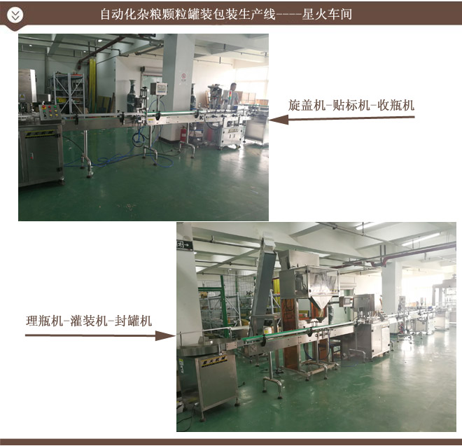 顆粒罐裝生產線-全自動顆粒罐裝包裝生產線由全自動理瓶機、顆粒自動稱重灌裝機、自動封罐機、直線式旋蓋機、自動貼標機、收瓶機組成;根據不同用戶的瓶裝,聽裝,桶裝,標準瓶,異形瓶及實際產品特性和用戶要求實現自動化;該設備能夠實現人工上瓶、備料后,自動理瓶、稱重、灌裝、旋蓋、封口、貼標、收罐等全過程的自動運行。減少勞動力,節約成品,實現無人化包裝生產