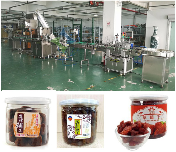 果脯包裝生產(chǎn)線由理瓶機全自動理瓶機、顆粒自動稱重灌裝機、自動封罐機、直線式旋蓋機、自動貼標機、收瓶機組成